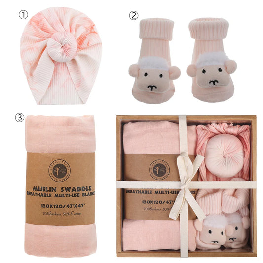 AUSHC - 4Pcs/Box Baby Socks Turban Hats Solid 120cm*120cm Muslin Cotton Saddle Newborn Gifts Elephant Fox Sheep Legging Sock